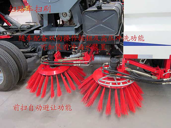 我们产品优势: 1.采用吸扫结合的方式收集垃圾,湿式除尘、电液控制,液压倾翻卸料的作业方式对路面进行清扫作业;能清扫树叶、果皮、矿泉水瓶、易拉罐、沙石金属碎屑、粉尘、煤渣等工业生活垃圾,工作效率为人工清扫方式的8-40倍; 2.采用副发动机专门驱动风机和液压系统,动力强劲,保证行驶过程中能继续工作,保证清扫过程的连续性; 3.中置四扫盘+进口液压马达驱动,稳定可靠,前扫盘有喷雾压尘系统,扫盘遇障防碰撞自动防避让功能及复位功能,扫刷臂转动机构使用高新耐磨工程隔套;扫盘转速可根据各种不同清扫路况,调整转速,能保证在各种污染状况下都有良好的清扫效果; 4.作业方式为中置四盘刷+后置吸嘴,便于清扫装置与吸嘴的调整和维护,可实现清扫路面及吸尘作业模式,分左扫、右扫及全扫三种; 5.后置可随路面自动找平的全浮动吸嘴,清扫效果好,进口原料制成的外翻式吸尘管,可防止吸尘管被划破、冻裂,增加使用寿命; 6.采用先进、高效的大型免维护台式专用风机,风量大;精密冷弯无缝液压油管,内壁无氧化杂质,保证液压油清洁,不堵阀; 7.副发动机与风机之间传动装置设有自动离合器,保证副发动机空载启动或停机时与风机的自动脱离,提高副发动机的稳定性; 8.法国施耐德控制开关,台湾液压阀组,LED尾部警示灯,手动泵应急系统; 9.水箱,垃圾箱均为不锈钢材质,耐腐蚀、容积大,内层光滑不锈,无骨架,卸料方便,便于清洗; 10.可选装倒车影像,作业监控,前冲后洒,前置绿化炮,后喷雾,手持吸尘管,手持高压卷盘水枪,垃圾箱自洁装置,雪铲等。