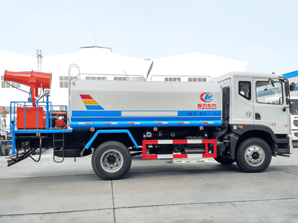 东风D9多利卡雾炮车罐体配置:洒水罐罐体为椭圆形或方圆,材质为武钢产4mm厚热板,罐体容积为10-15立方米(可根据用户要求制作),可载水12-15吨,上户吨位为9.2吨。罐体采用对接焊工艺制造,进行气压检漏试验,配备取力器、洒水泵及绿化炮等装置,带消防接口,可通过消防栓进水,并带有工作平台,具备有前冲、后洒、侧喷等洒水功能,同时绿化炮的出水形态可根据需要调节成柱状、大雨、小雨及雾状等,可全方位旋转,其射程可达28米以上。