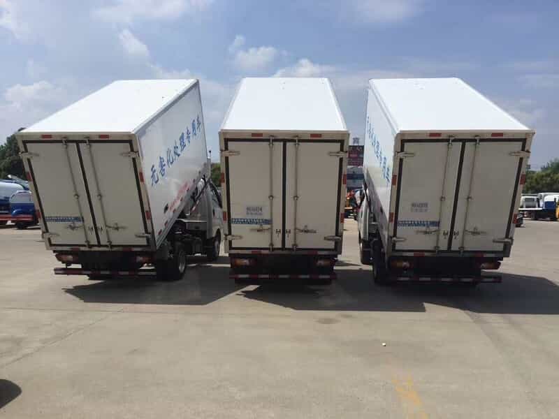 主要配置: 1.密封车厢:为保证病死动物在转运途中不造成二次污染,无害化转运车的厢体需要严格密封,我厂生产的无害化转运车,车厢材料可选择玻璃钢、彩钢板、铝合金、不锈钢这四种,我们推荐的类型有:内不锈钢外玻璃钢。内部采用不锈钢材质,便于清洗,不生锈,不变形,干净卫生;外部用玻璃钢,光滑美观,密 封性好,保温性好。在两层厢板中间填充8cm厚聚氨酯发泡材料,保温隔热。这款配置完全可以满足无害化转运的要求 ,甚至达到了医疗废物的运输标准。