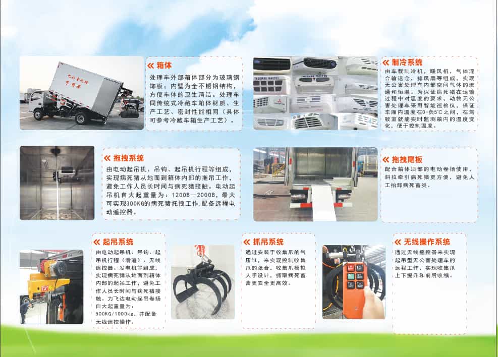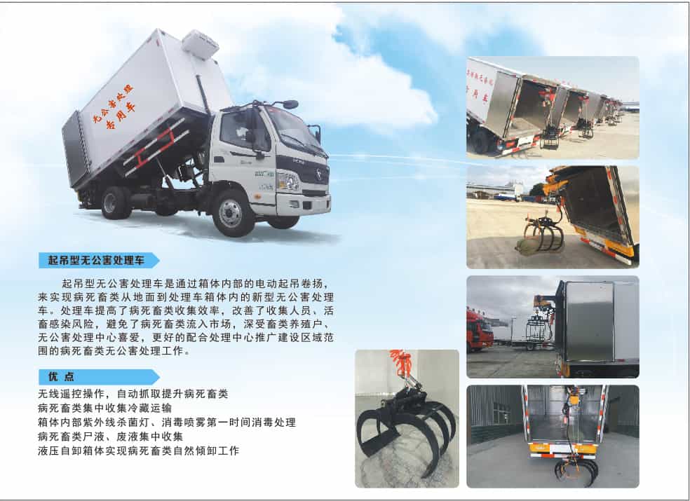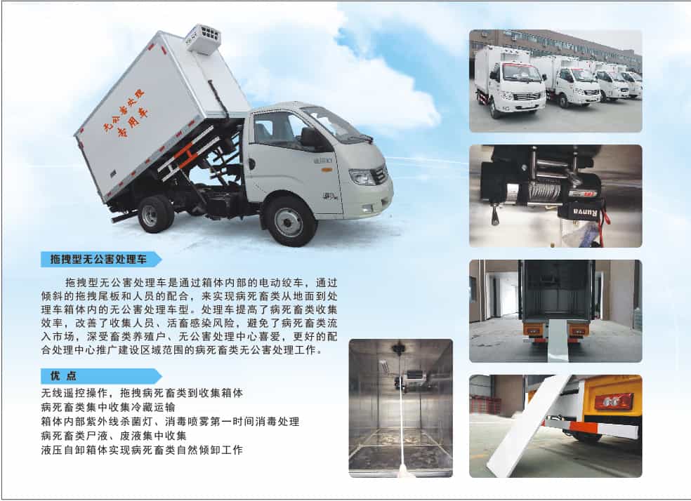 死猪无害化处理收集车无公害处理收集车专用车现在必不可少的一种专用车,它主要收集病死猪、牛、羊等动物,将它们转运到无害化处理中心,避免这些病死动物疫情的传播,也避免了它们流向餐桌。无害化处理车是冷藏车的一种,它对厢体的密封性要求极其严格,同时它也具备消毒功能和衡温功能,在运输过程中对病毒经行控制。动物无害化处理车目前用的冷藏车公告生产。